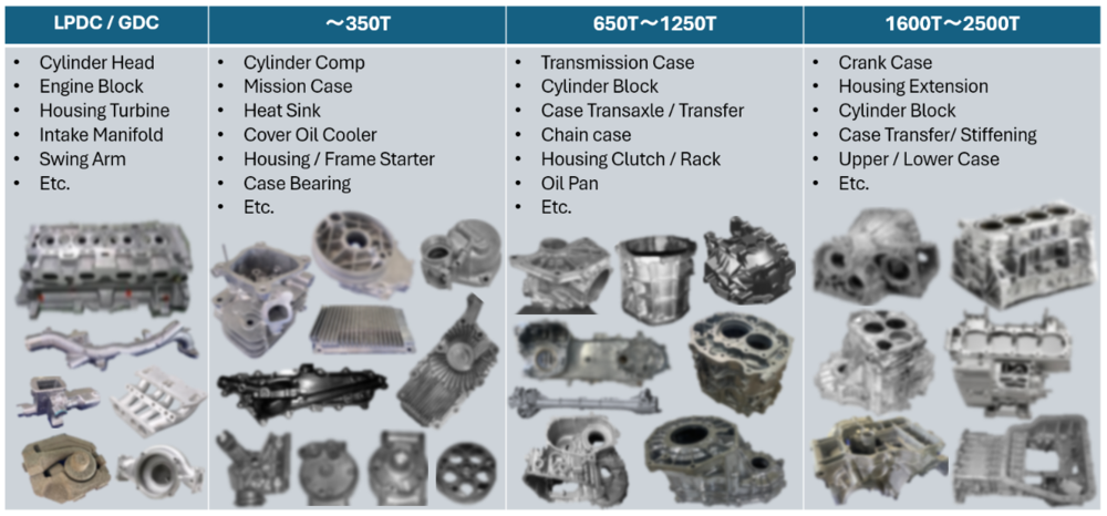 - ความเชี่ยวชาญ: บริษัทมีความเชี่ยวชาญในการออกแบบและผลิตแม่พิมพ์หล่อโลหะ (Die-casting mold) ทั้งแบบแรงดันต่ำและแรงดันสูง รวมถึงแม่พิมพ์ฉีด (Injection mold) และแม่พิมพ์หล่อแบบถาวร (Gravity die-casting mold)